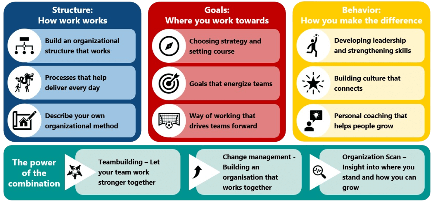We stappen jouw organisatie binnen als een soort lid van de club en samen bouwen we aan wat echt nodig is. Daarbij kijken we niet alleen naar hoe de organisatie presteert, maar ook naar het team en de mensen zelf. Dat doen we altijd met oog voor de mens van vandaag, niet voor de gewoonten van veertig jaar geleden.