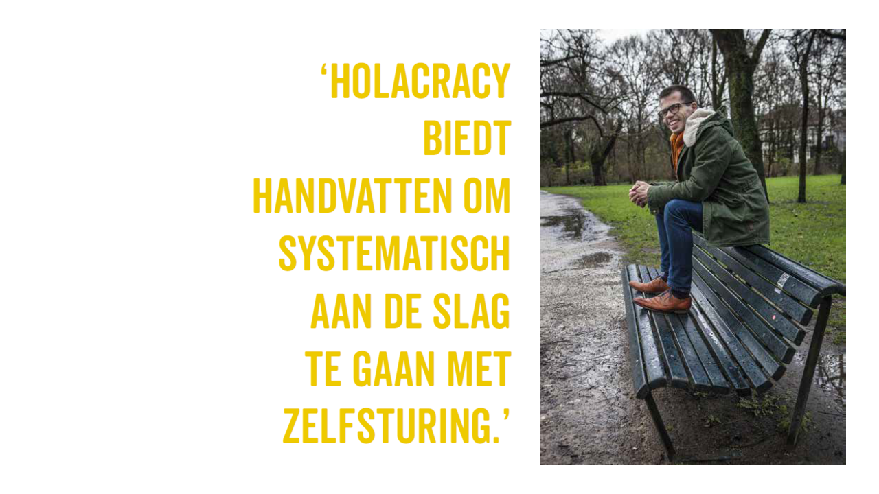 ‘Vijf jaar geleden wist bijna niemand wat je bedoelde met holacracy of zelfsturing. Pakweg drie jaar geleden hadden veel mensen ervan gehoord, maar moest ik me bij wijze van spreken vaak verantwoorden waarom ik bezig was met dat “aparte gedoe”. Nu kom je in allerlei media artikelen tegen over andere manieren van organiseren, zelfsturing en ook holacracy. Men ziet het wellicht nog als “voorbehouden aan bijzondere organisaties”, maar het is geaccepteerd als een valide alternatief.’ Overal om zich heen ziet Koen Veltman de verschuiving. ‘Veel bedrijven zijn bezig met agile-achtige concepten – zelfs traditionele corporates zoals ing met hun tribes en squads. Bij bedrijfskunde en mba- opleidingen kwam zelfsturing eerst via een gastdocent of keuzevak aan bod, maar het wordt nu een vast onderdeel van het curriculum. Over tien jaar zijn dit soort zaken gemeengoed, verwacht ik. En wie weet komt er een moment dat we zeggen: “weet je nog dat we zoveel managers hadden…” Maar dat zal nog wel wat langer duren.’